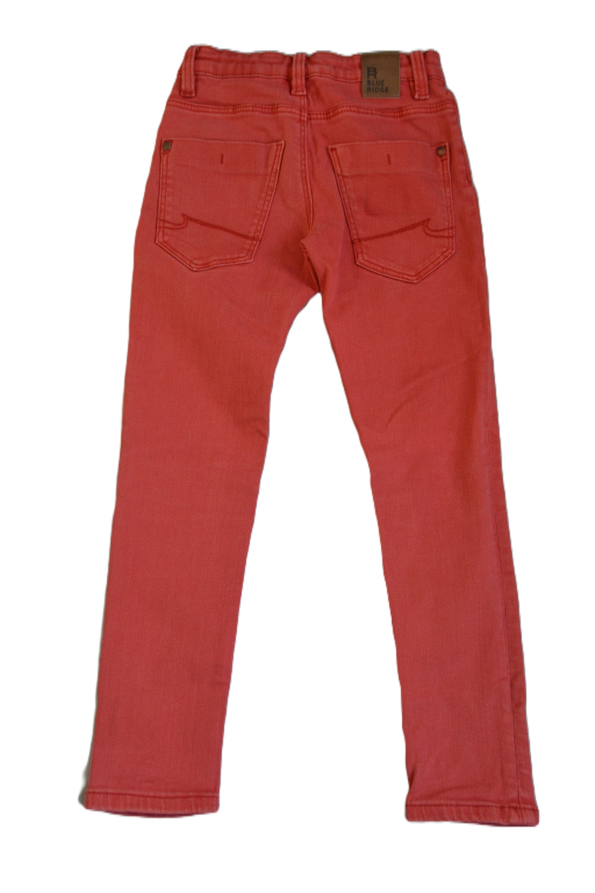 Lichtrode jeans van WE Blue Ridge, ongeveer maat 128. De kleur is iets lichter dan op de foto lijkt. De taille is voorzien van verstelbaar taille elastiek.