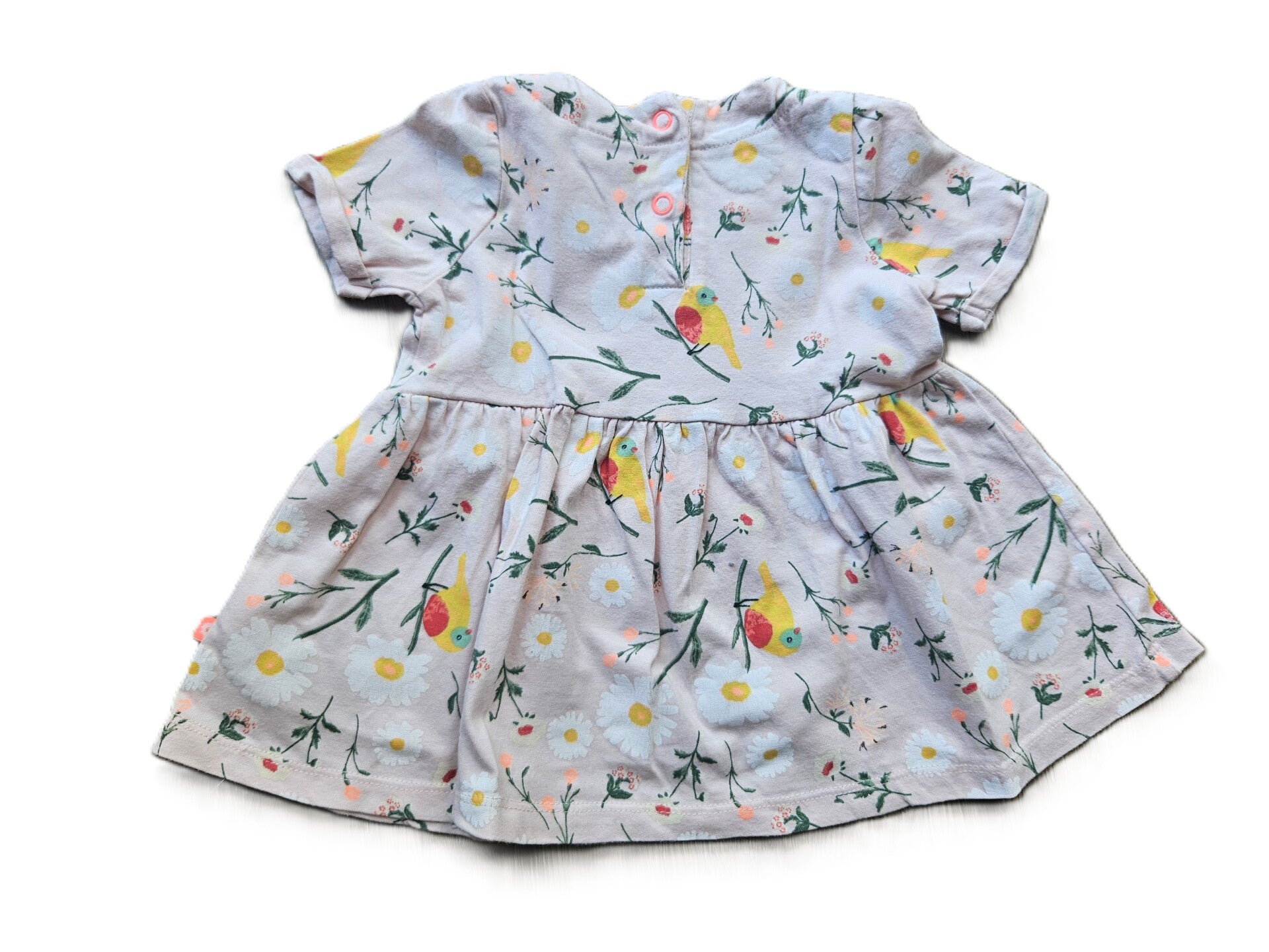 Lichtroze jurk met bloemetjes van Hema. De maat op het label is 74, maar deze valt kleiner, als maat 68.