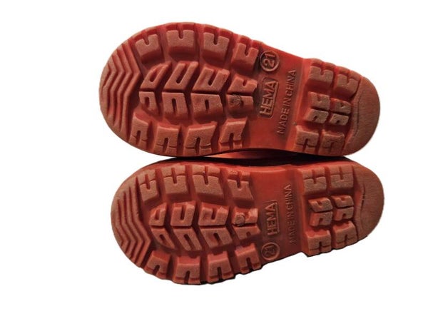 Rode regenlaarsjes van Hema met Jip en Janneke er op. De laarsjes zijn maat 21.