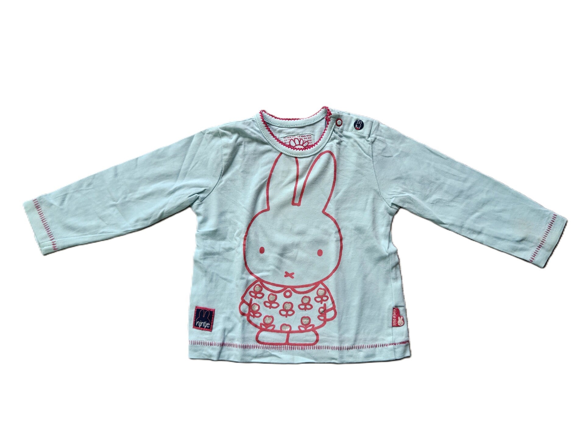 Lichtblauwe longsleeve van Nijntje, maat 68. Op de linkermouw zit onderaan een lichte vlek.